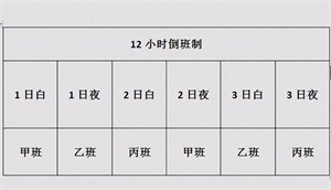 12小时倒班制一个工作流程为3天72小时,每个班组3天内上两个班次,每个班次12小时,一次为白班,一次为夜班,每次休息时间为24小时,往复循环。具体可以做如下安排。