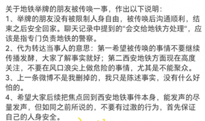 近日,西安地铁安保人员执法不当导致女乘客多处走光一事在网络中引起热议,事发后有多名女生自发在事发地铁中举牌抗议,“地铁声明避重就轻”、“严禁恶意包庇”、“我是西安人,等西安地铁一个道歉”等字样,9月5日,一名网友称自己一位在地铁中举牌抗议的朋友被警方带走。