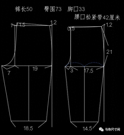 裤长可以根据喜欢的长度适当调整,腰头和脚口根据松紧带宽度加出折边即可。