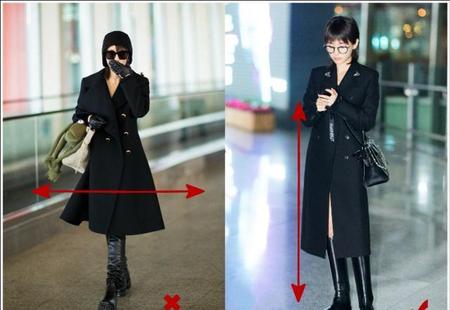 A字型或是裙摆设计的大衣不能选。穿上超级显胖显矮!H型比较合体的大衣最为显高了!看看王子文的这组对比图就能说明一切!大衣剪裁越利落简单就越能够修饰身材,还不易过时!