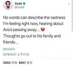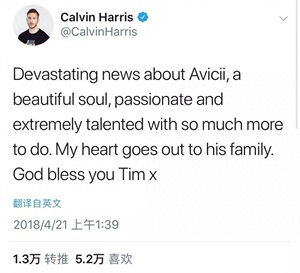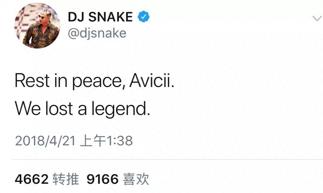 圈内众多DJ都发文缅怀A神,言语间都是对他逝世噩耗的难过与五无尽的怀念之情。霉霉前男友Calvin Harris、Zedd、DJ Snake......