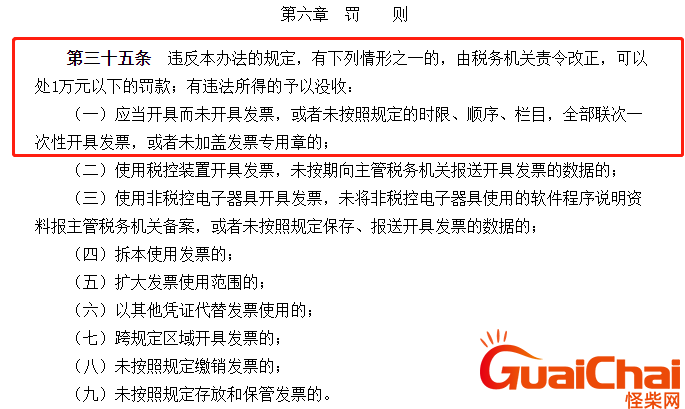 第三十五条,违反本办法的规定,有下列情形之一的,由税务机关责令改正,可以处1万元以下的罚款;有违法所得的予以没收:(一)应当开具而未开具发票,或者未按照规定的时限、顺序、栏目,全部联次一次性开具发票,或者未加盖发票专用章的。
