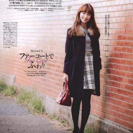 牛角扣的蓝色大衣,小个子女生也能穿出大牌范儿。格子衬衫红色的半身短裙活力十足。