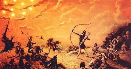 传说中后羿和嫦娥都是尧时候的人,神话说,尧的时候,天上有十个太阳同时出现在天空,把土地烤焦了,庄稼都枯干了,人们热得喘不过气来,倒在地上昏迷不醒。因为天气酷热的缘故,一些怪禽猛兽,也都从干涸的江湖和火焰似的森林里跑出来,在各地残害人民。 人间的灾难惊动了天上的神,天帝常俊命令善于封射箭的后羿下到人间,协助尧除人民的苦难。后羿带着天帝赐给他的一张红色的弓,一口袋白色的箭,还带着他的美丽的妻子嫦娥一起来到人间。