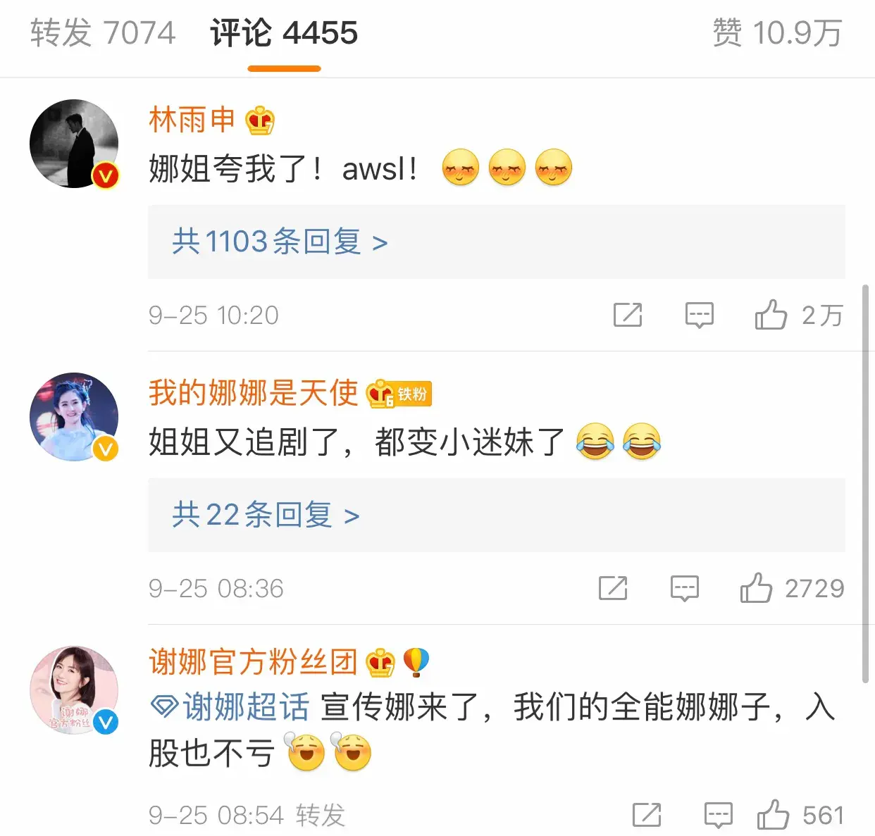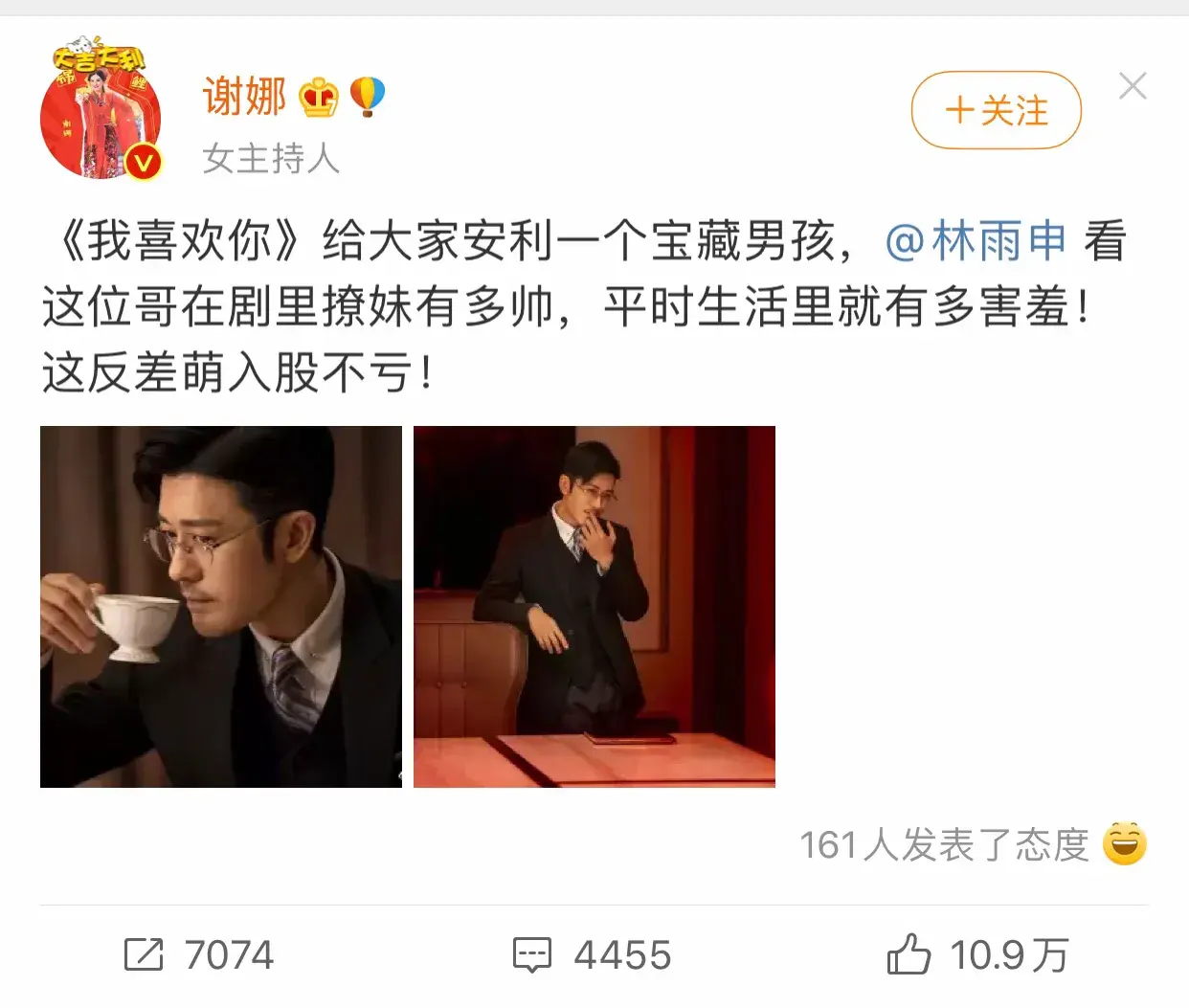 9月25日,谢娜在某社交平台(微博)发了一条动态在线表白林雨申,配文“给大家安利一个宝藏男孩,看这哥在剧里撩妹有多帅,平时生活你就有多害羞,这反差萌入股不亏。”
