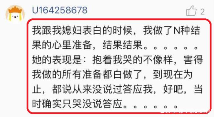 我跟我媳妇表白的时候,我做了N种结果的心里准备,结果结果。。。。。。她的表现是:抱着我哭的不像样,害得我做的所有准备都白做了,到现在为止,都说从来没说过答应我,好吧,当时确实只哭没说答应。。。。。。