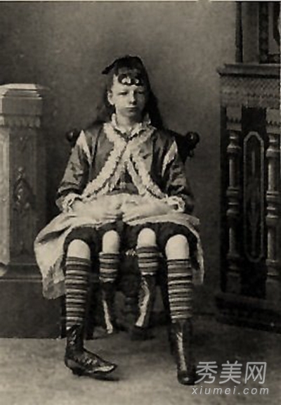 图中的Josephine Myrtle Corbin在1868年的时辰身世在田纳西州的林肯镇。她生出来的时辰就是双臀畸形,也就是说她腰手下来双方别离有一个独立的骨盆。这就像Frank Lentini的第三条腿那样,多余的两条腿原来是属于另一个没有正常疏散的双胞胎姐妹的。内侧的两条小一点的腿别离和外侧的大腿各自连在一路,成为一对。听说她曾经靠她内侧的两条腿移动过,但它们其实太衰弱了无法走路。Myrtle Corbin生了四个女儿和一个儿子。
