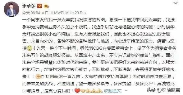 从他的这一段微博中我们可以看得出余承东在华为20多年的履历是很丰富的,他从一个农村小子考上清华大学研究生;又从一个基层的技术研发工作者到了华为的消费者业务CEO,靠的就是自己踏踏实实一步一步走上来的。