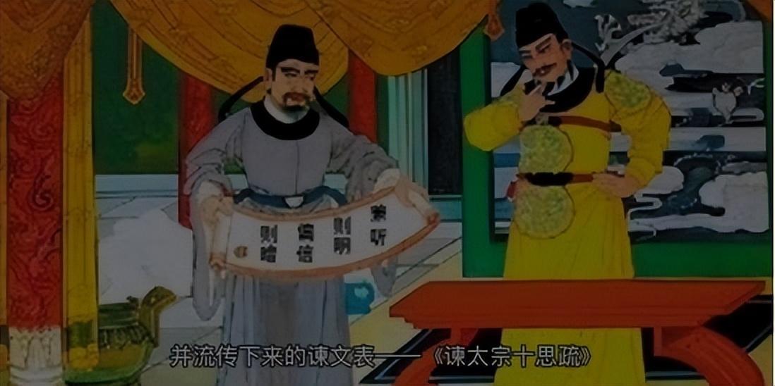 唐太宗赶到魏宅,魏徵刚写完奏章,正拿着御剑要抹脖子。唐太宗抢先一步:住手!他抓住魏徵肩头说,“朕对不住爱卿呀!现在,我把御剑赐给你,你以后上朝也可佩戴在身上,作为我的一个教训。”当看到魏徵面临死亡还在写的奏章《十渐不克终疏》,感慨万千!