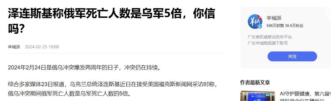 信息源:泽连斯基称俄军死亡人数是乌军5倍,你信吗?羊城派2024-02-25。
