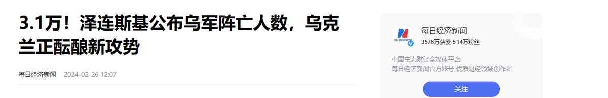 信息源:3.1万!泽连斯基公布乌军阵亡人数,乌克兰正酝酿新攻势,每日经济新闻2024-02-26 。