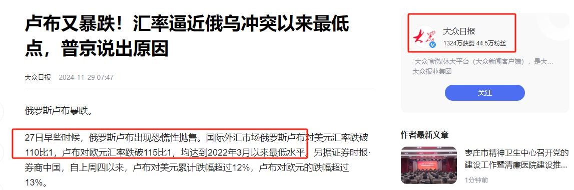 大众日报-卢布又暴跌!汇率逼近俄乌冲突以来最低点,普京说出原因