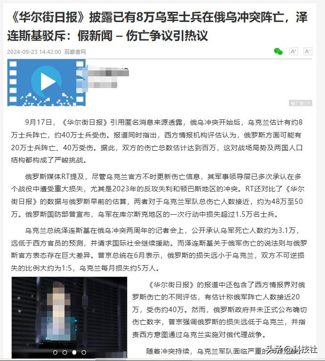 参考资料:观察者网——《华尔街日报》披露已有8万乌军士兵在俄鸟冲突阵亡,泽连斯基驳斥:假新闻-伤亡争议引热议