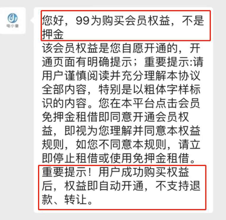 记者从电小童在线客服回复冯女士的对话中看到,客服称:"99 元为购买会员权益,不是押金,该会员权益是您自愿开通的,开通页面有明确提示……用户成功购买权益后,权益即自动开通,不支持退款、转让。"