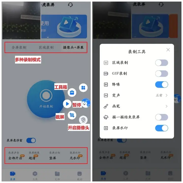 可以通过悬浮窗打开录制的摄像头,拍摄前置内容还是后置内容都是可以的,通过悬浮窗我们还可以控制录制的暂停/结束、使用录制工具(包括有变声、GIF录制、降噪、画笔、截屏、水印等)。