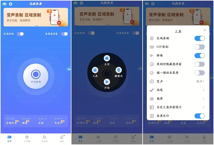 一款集屏幕录制功能以及视频剪辑功能为一体的手机软件。安卓手机适用,可以录制手机屏幕与摄像头内容,支持自定义录制区域以及画质清晰度,不管是用来录制视频课程、会议、直播还是用来录制游戏都不是问题。