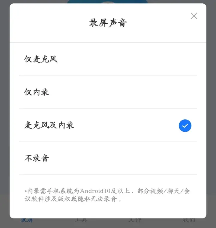 声音可以设置仅录制手机声音、仅录制麦克风声音或是二者都录制。