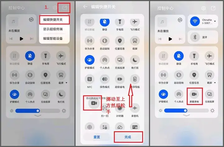 点击右上角的【编辑】按钮,选择【编辑快捷开关】,往下翻找到【屏幕录制】长按将它挪动至上方快捷菜单显示页松手,点击【完成】,它就出现在控制中心啦。