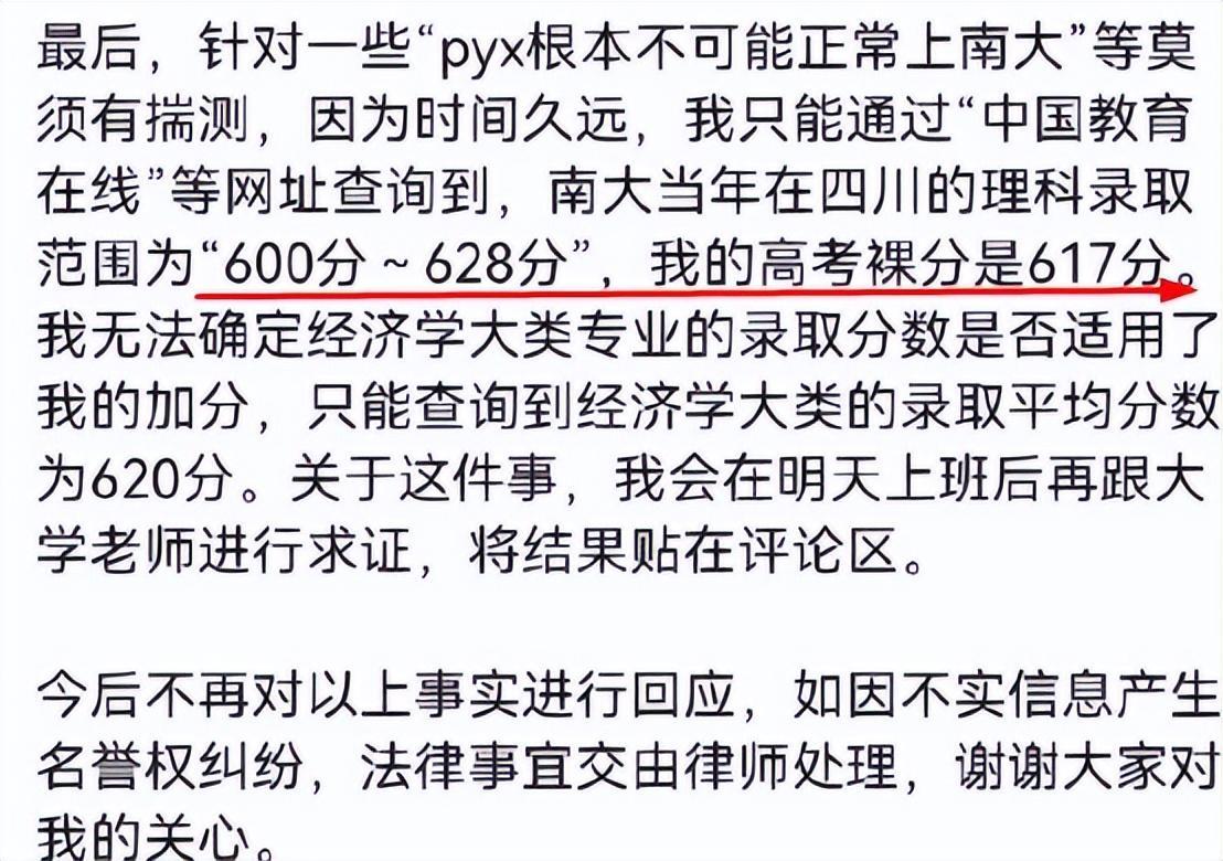 其次他回应了自己的高考裸分成绩为617分,裸分成绩就是没经过任何加分高考考出来的实打实的分数,而当年南大在四川的理科录取分数段在600-628,他不知道自己被南大录取是否使用了证书加分,因为就算没有这个加分,凭裸分成绩也能被南大录取,所以这一点他只能和大学老师求证。