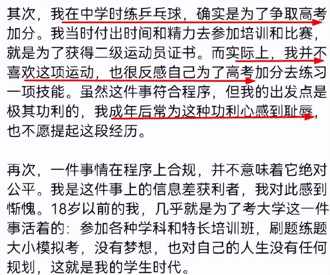 而在文章中小蒲也对运动员证书这件事做出了解释,虽然运动员证加分这件事是存在且合理的,但是他当年的确是为了高考加分而去训练的乒乓球,事实上他不喜欢这项运动,如今回想起来也为当年自己的功利心感到不好意思。