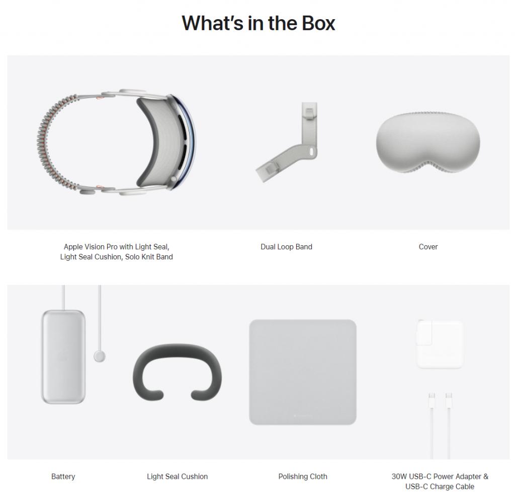 当然,苹果 Vision Pro 头显也默认给了不少配件,比如头带、30W USB-C 电源适配器和 USB-C 充电线、外接电池、抛光布、头显保护罩等。