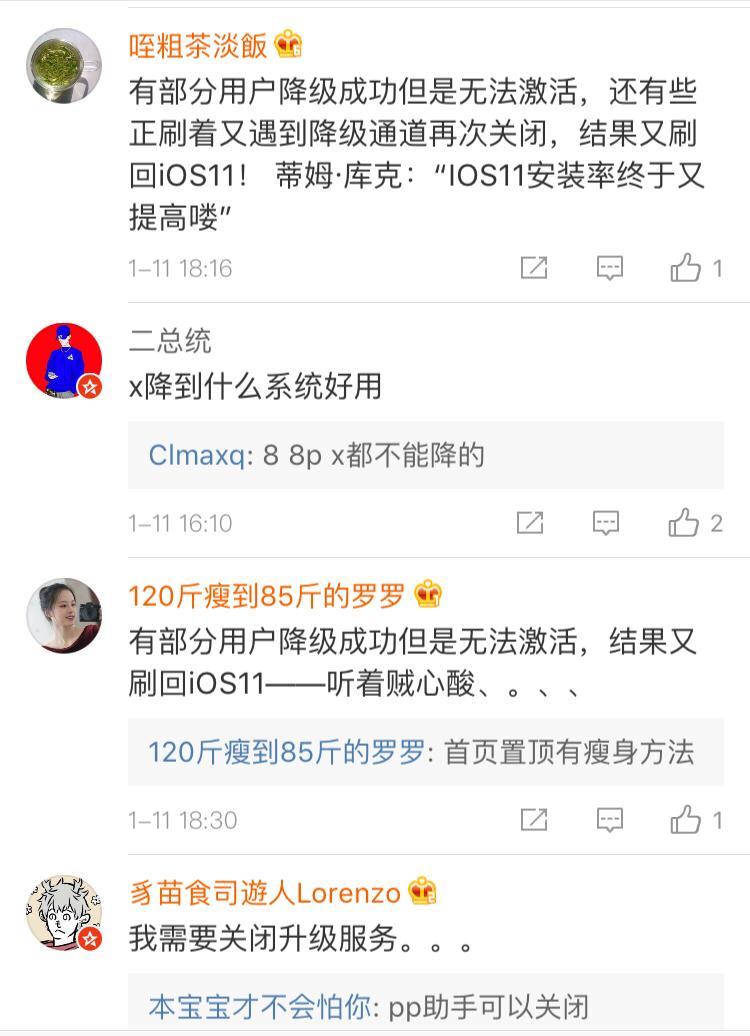 而就在苹果开放ios降级通道后,好多人在忙着给自己的手机降级的时候,大约二十分钟后苹果又关闭了降级通道。致使许多用户虽然降级成功但却无法激活,迫于无奈又不得不刷回ios11。