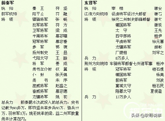 这是淝水之战两军参战的对比,不论是将领、谋士还是兵力我前秦都远超你东晋,那我苻坚还没有“膨胀”的资本么?我觉得我是必胜的。