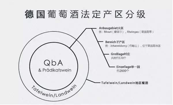 区别于前面的几产区,德国葡萄酒标上出现的QbA或Prädikatswein分级名称并没有从字面上直接强调地理的范围限定,而是对葡萄酒品质(或者说是成熟度)的认定。但QbA或Prädikatswein级别的葡萄酒必须标明产区,在概念上,同样表示高于地区餐酒Tafelwein和Landwein的品质葡萄酒分级。所有的QbA或Prädikatswein必须来自德国的13个葡萄酒产区,并且产区名称必须出现在酒标上。