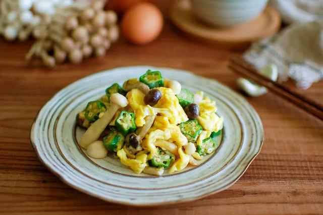 秋葵用盐搓洗,将上面的绒毛洗去,洗净切粒备用。白玉菇和蟹味菇掰开冲洗一下,葱、蒜切末备用。鸡蛋加能吃盐及少许油打发。热锅,加少许油,加入蒜蓉、葱末爆香。依序加入鲜菇和秋葵炒熟,加少许盐调味12种。最后倒入蛋液快速炒成滑蛋,即完成。