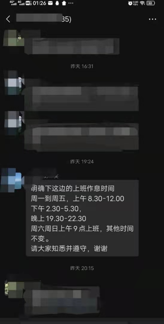 这是上海某家公司一名leader在员工群给一些新员工强调公司的作息时间的截图。