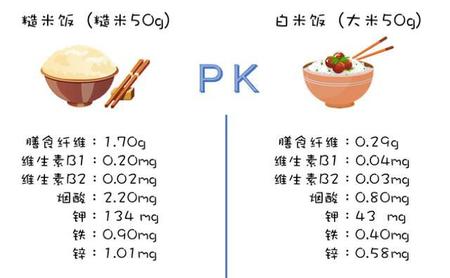 如果某天你在一份糙米饭(糙米50g)和一份大米饭(精米50g)之间犹豫,咱们来比较一下它们的营养素含量,就容易做出选择了。