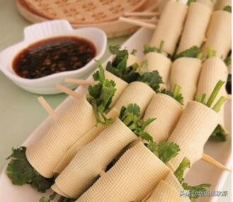 4、香菜放在豆皮中卷起,穿在竹签上,将调味料混合均匀后一起上桌即可。