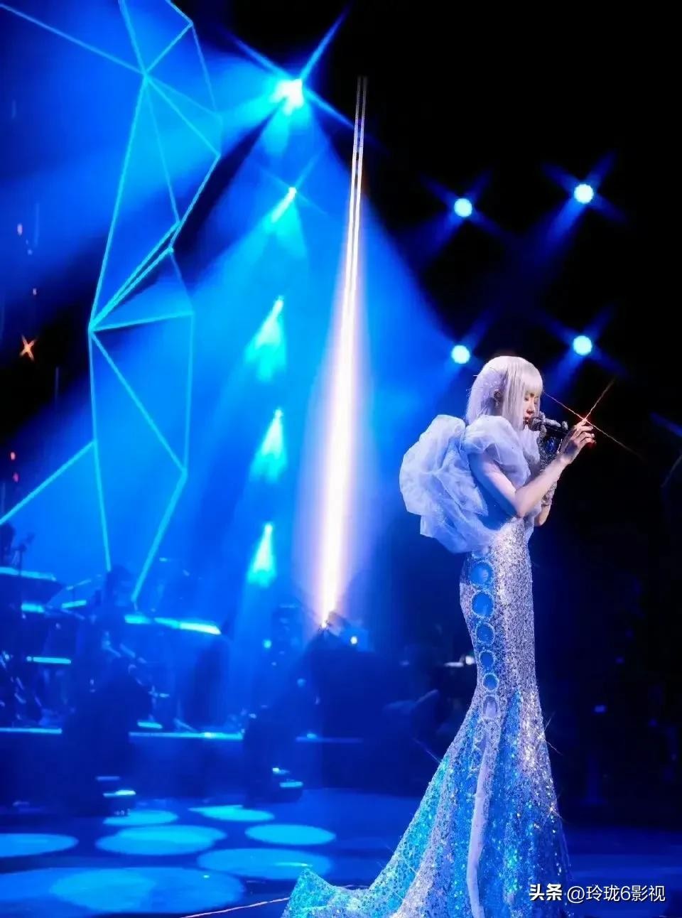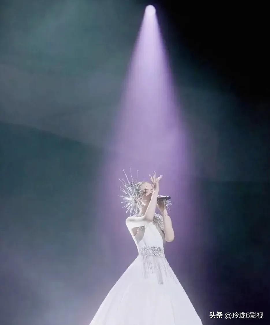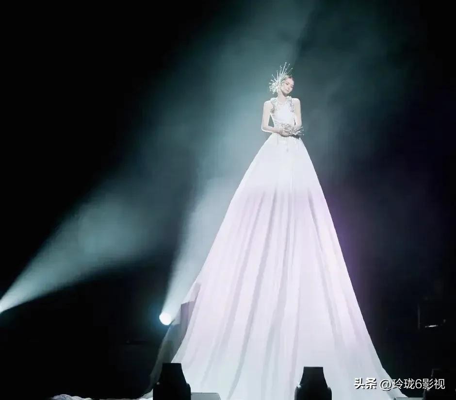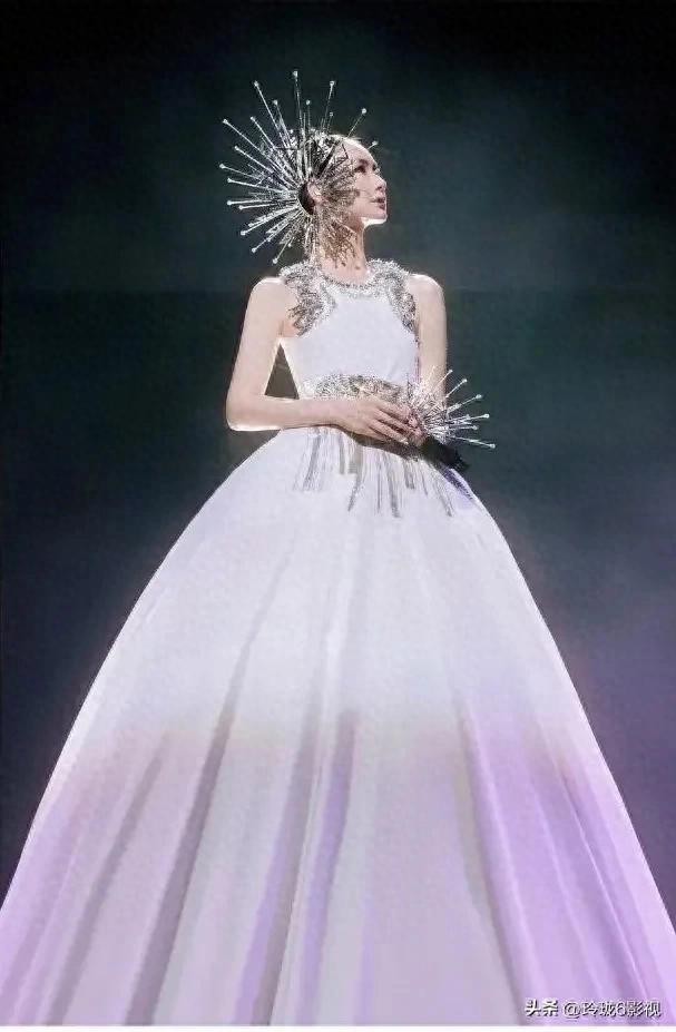 其中曼妙闪耀的银色流光裙,头上的发饰犹如孔雀开屏。像极了一条美人鱼,三层楼高的白色拖地礼裙