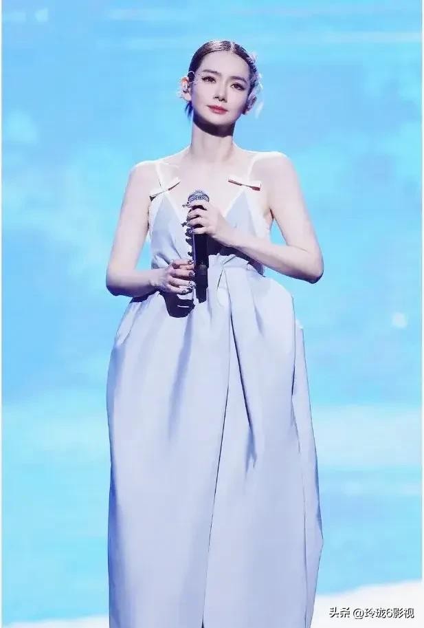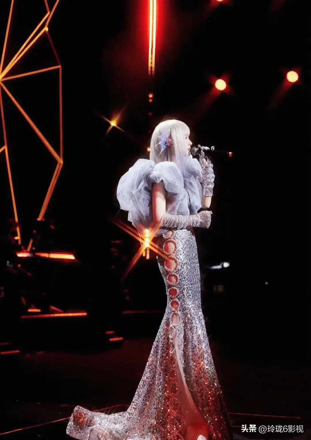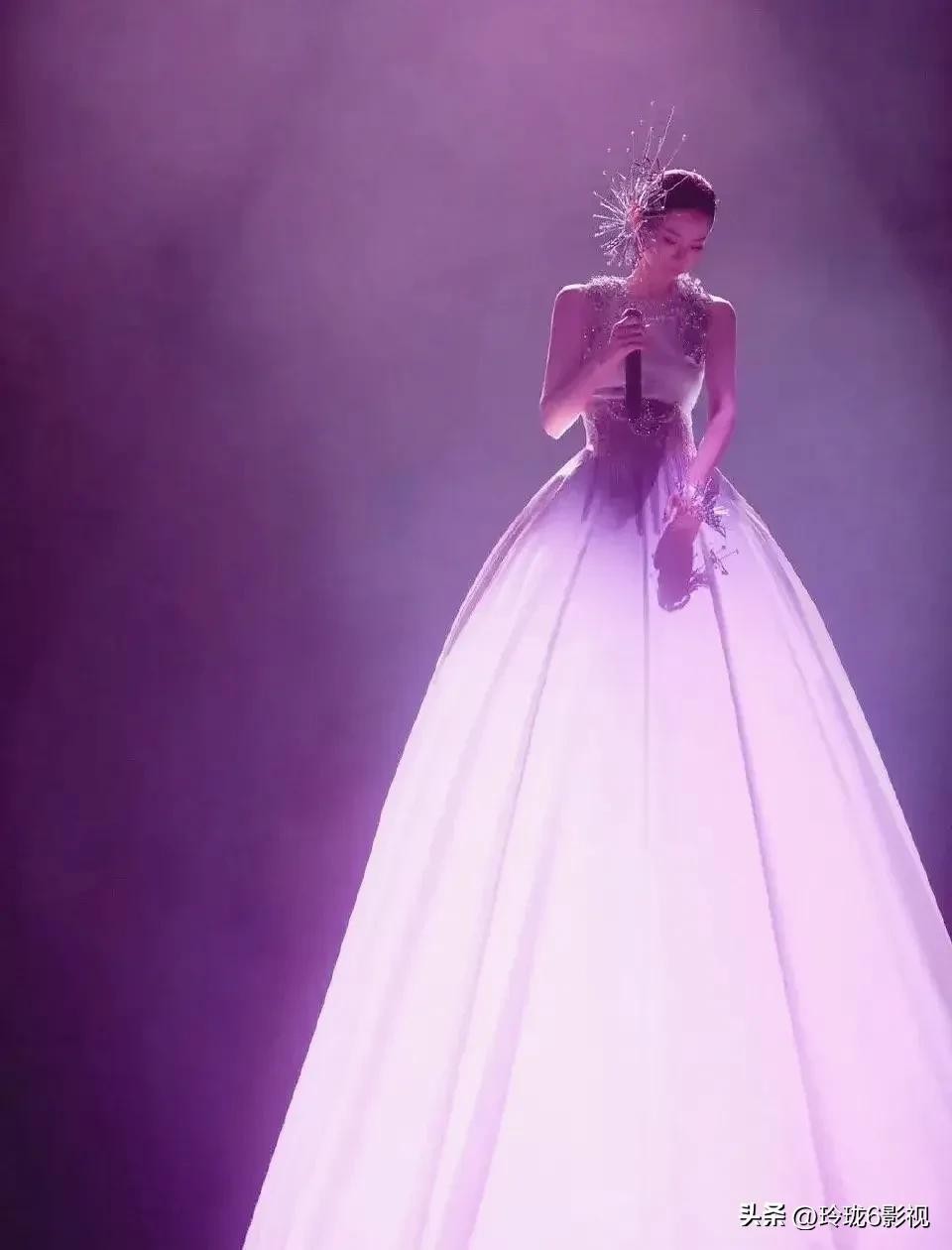 其中曼妙闪耀的银色流光裙,头上的发饰犹如孔雀开屏。像极了一条美人鱼,三层楼高的白色拖地礼裙
