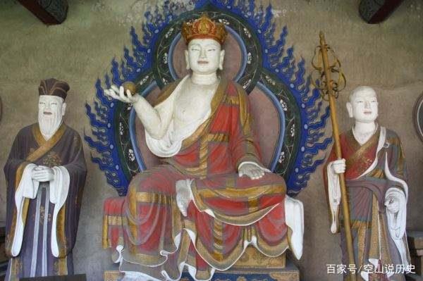 这个金乔觉和尚就是地藏菩萨转世的金地藏,现在肉身殿供奉的金地藏像两旁左为道明,右为闵公。闵公后来还成了九华山的财神。