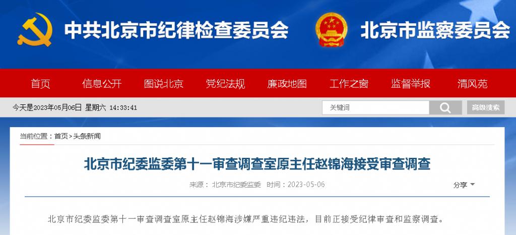 今年 5 月 6 日,北京市纪委监委发布消息,市纪委监委第十一审查调查室原主任赵锦海涉嫌严重违纪违法,目前正接受纪律审查和监察调查。