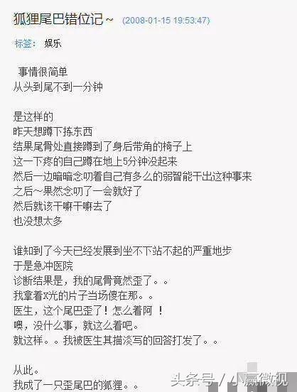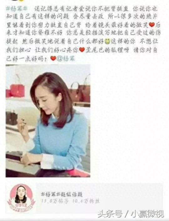 早在08年,杨幂就在自己的博客上写出自己在一次不小心中伤到了自己的脊椎,尾骨错位,光听到这几个字眼都觉得疼。