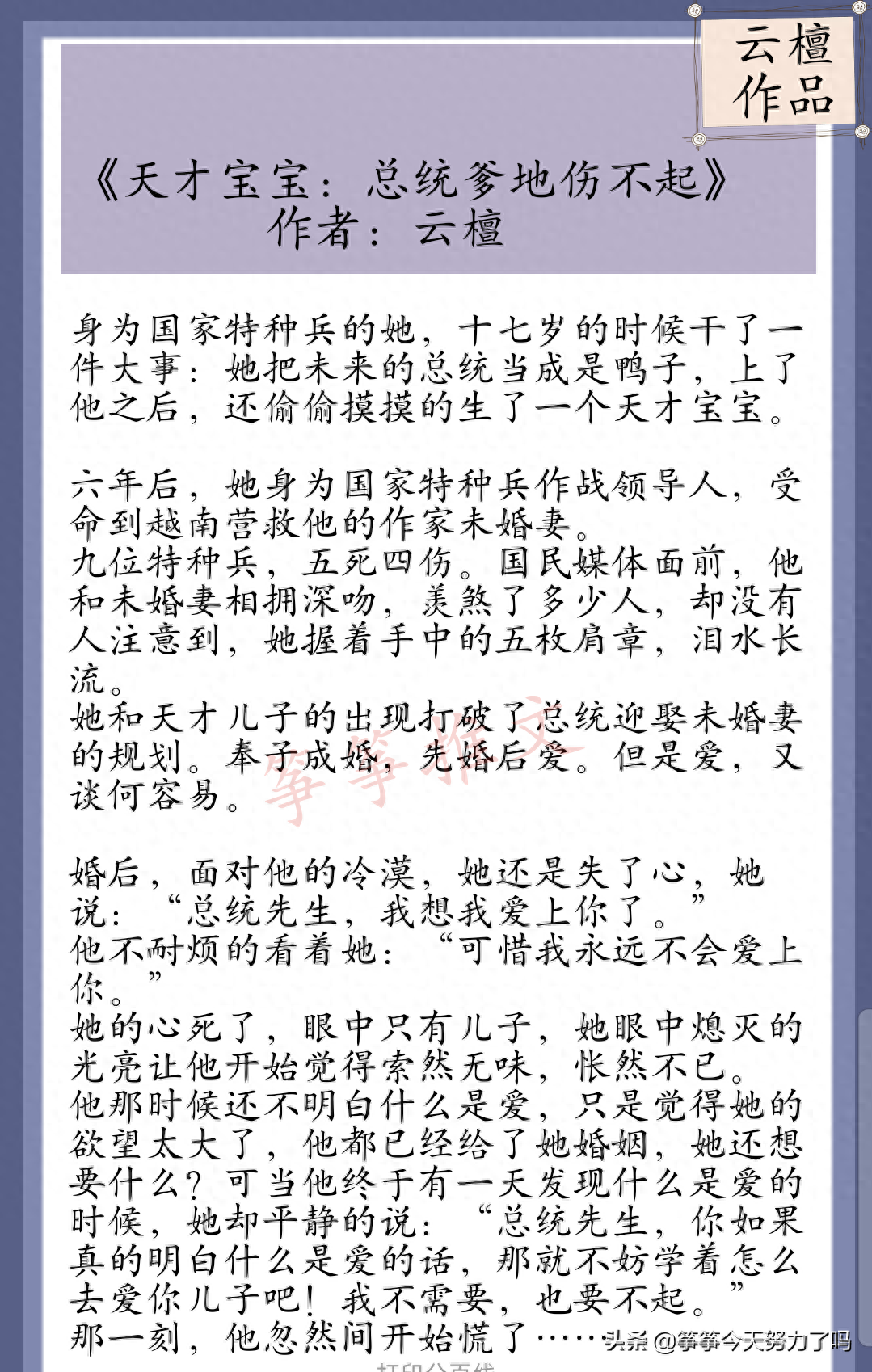 云檀写的所有作品都是高质量,文笔极好,剧情紧凑甜中带虐,人物刻画的非常饱满,唯一不足的就是小说名字起的有些玛丽苏。