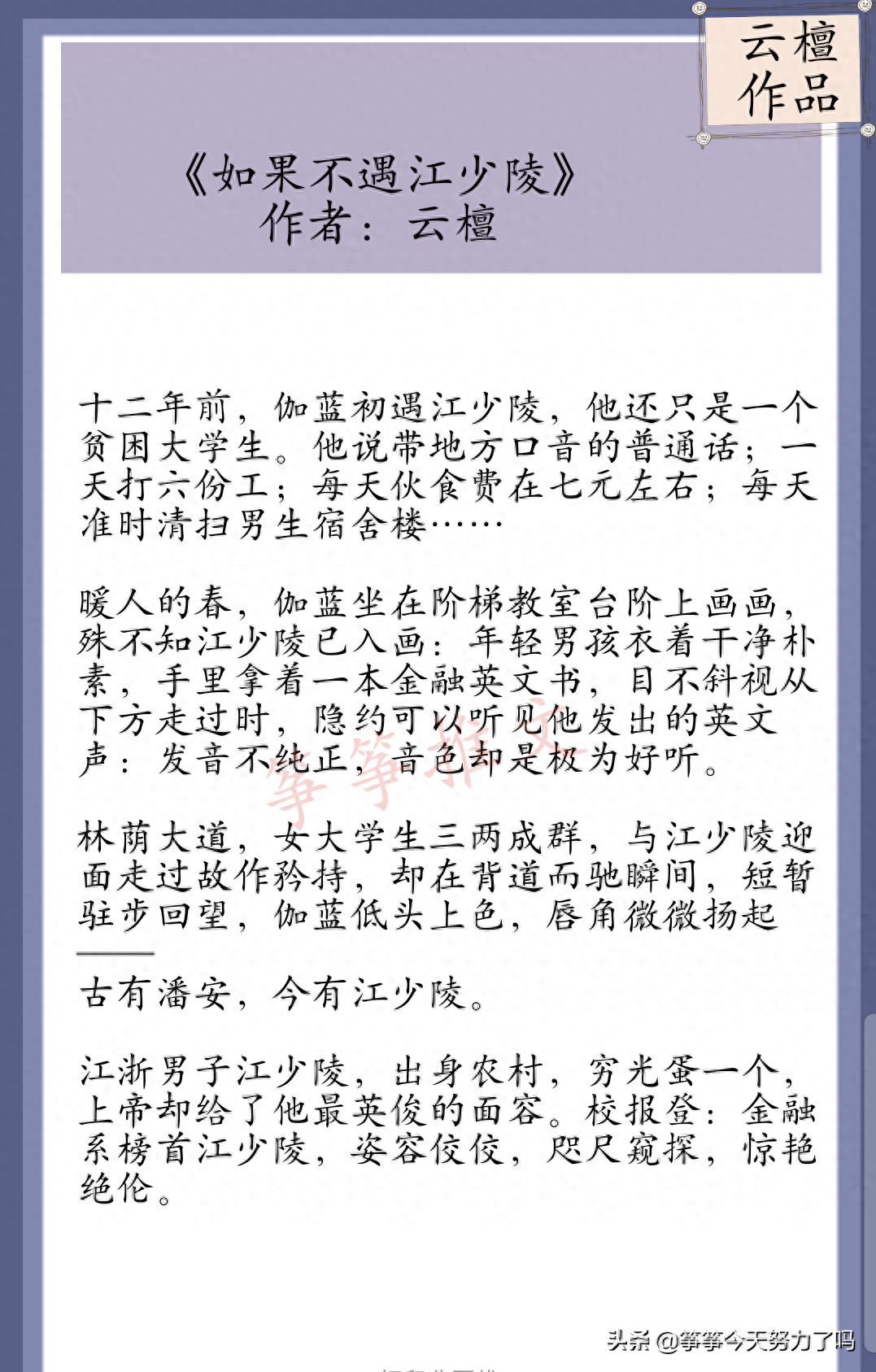 她的作品中最爱《如果不遇江少陵》《陆少的秘密恋人 》 这两本小说,陆子初应该是很多人青春时期的白月光男主。