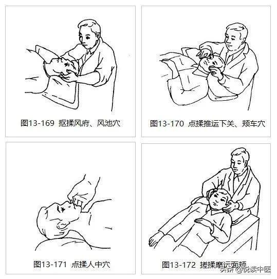 操作步骤:①患者仰卧于治疗床上,术者坐其床头前方,双手中指抠揉风府、风池、哑门、翳风穴(图13-169),各约半分钟。②双手拇指点揉推运两太阳、神庭、百会穴,各约1分钟。③中指点揉推运两侧阳白、攒竹、鱼腰、丝竹空、耳门、听宫、听会、上关、下关、颊车穴,各1分钟(图13-170)。④中指指尖点揉推运承泣、四白、迎香、地仓、禾髎、人中、承浆穴(图13-171)。⑤手掌搓揉患侧面颊部肌肉(图13-172),拇指掐揉内关、合谷穴,各3~5次。