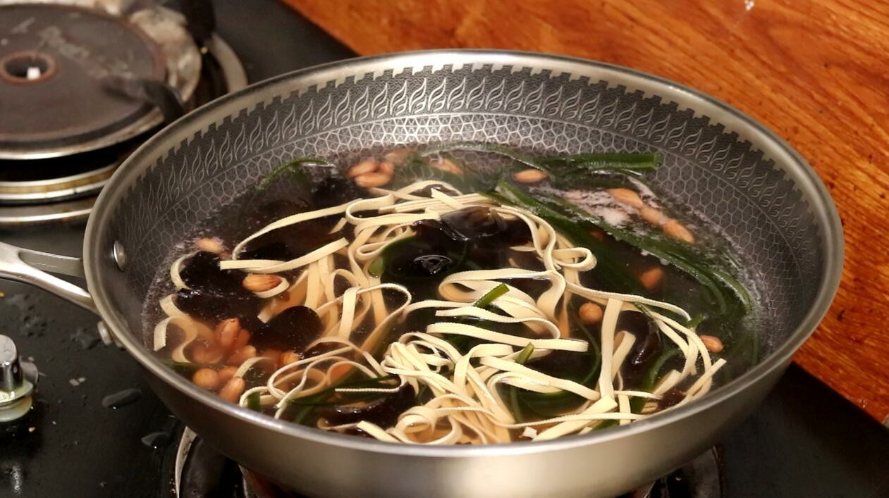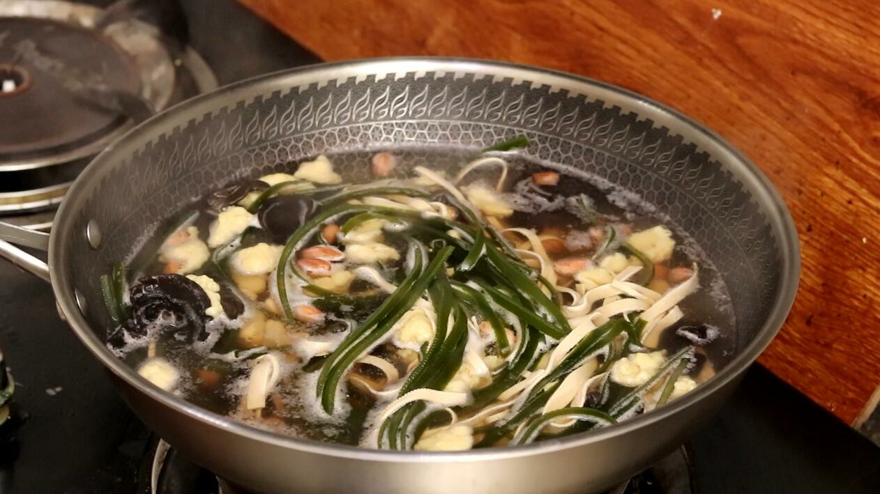 第四:锅中加入适量的清水,烧一锅水,凉水下入花生米,水开之后先下入海带,倒入木耳,千张,将面筋伸开,弄成小片直接放入锅中