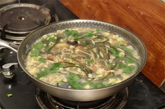 第五:现在开始调味,放生抽,多放一点胡椒粉,一勺盐,半勺十三香,搅拌均匀,将沉淀好的面粉水慢慢倒入锅中,大火烧开之后再淋入鸡蛋液,大火烧开,撒一点香菜就可以吃了