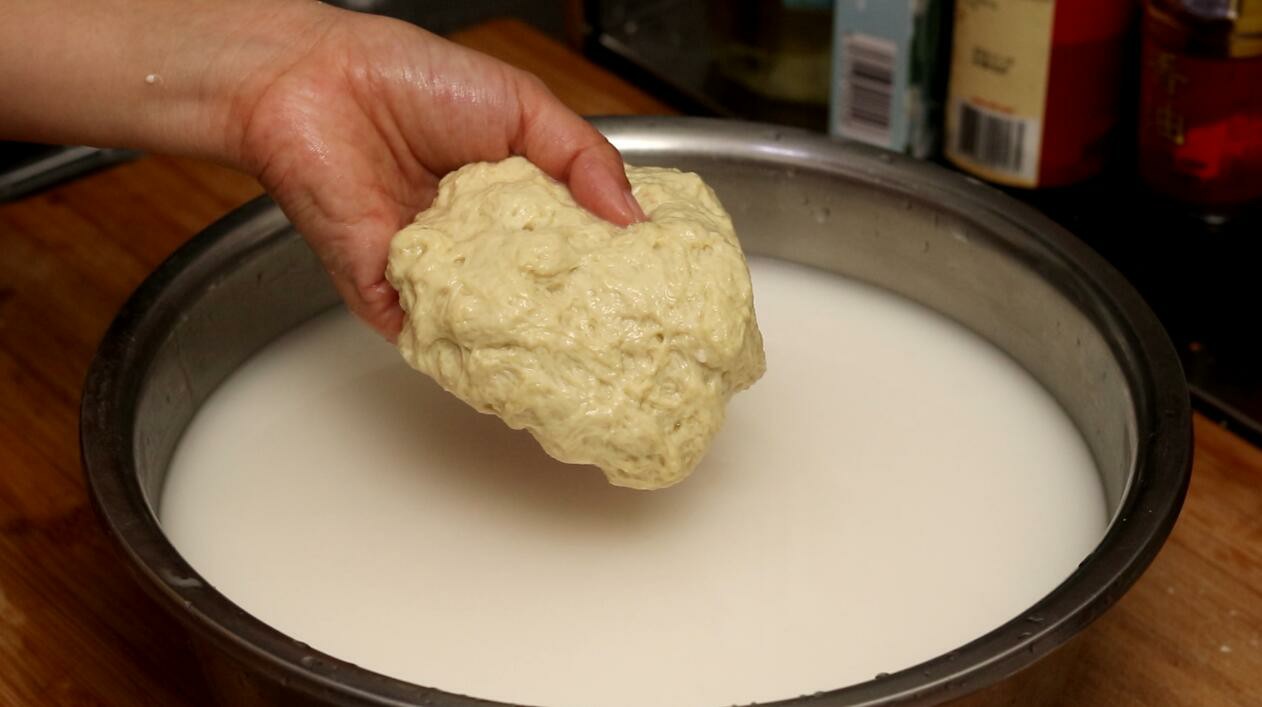 第二:现在开始洗面,将揉搓好的面团放入清水中,揉搓,要多洗几遍,揉搓出来面筋团即可,然后将洗出来的水静置半小时沉淀,备用,揉搓好的面水静置好,下面都是淀粉,将上面的清水去掉备用