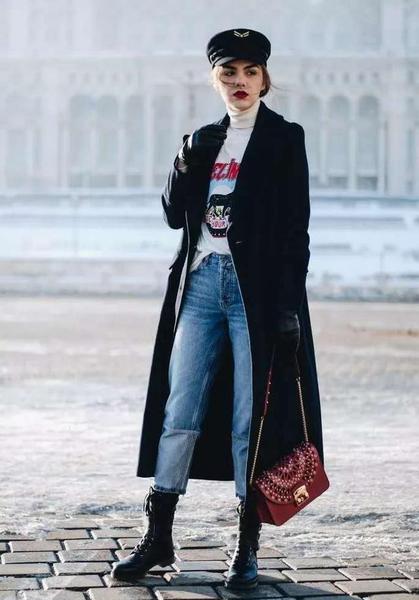 冬天天气寒冷,长款大衣搭配马丁靴,保暖又时尚,大衣可以选择西装款式整体会显得非常干练利索。
