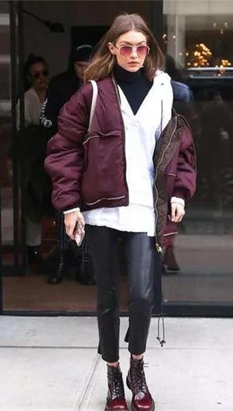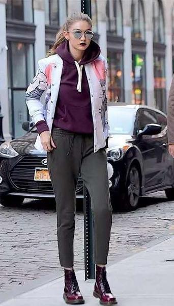 想要将马丁靴穿出女人味,有一个原则是:下半身尽量露出腿。运动衣的宽松可以遮住臀部,上宽下窄,显高显瘦还显女人味哦。