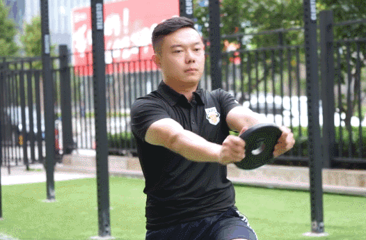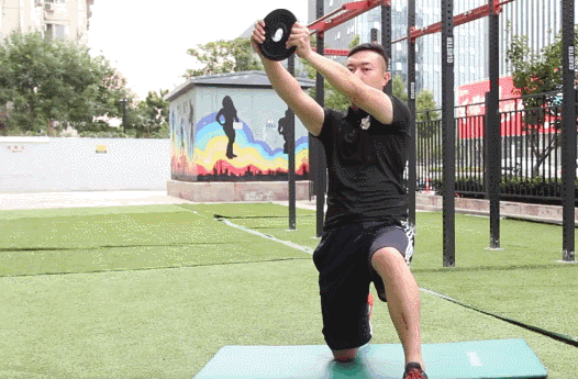 和上一个动作有一点相像,但不同的是,这是一个从下至上运动的动作,我们上一个伐木动作是一个从上至下运动的动作,这两个动作都是可以有效锻炼我们人鱼线的训练动作。和上一个动作一样,你需要保持一个单膝跪地的跪姿,将我们的背部挺直,然后双手握住重量合适的杠铃片。